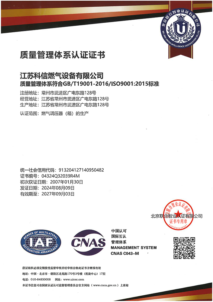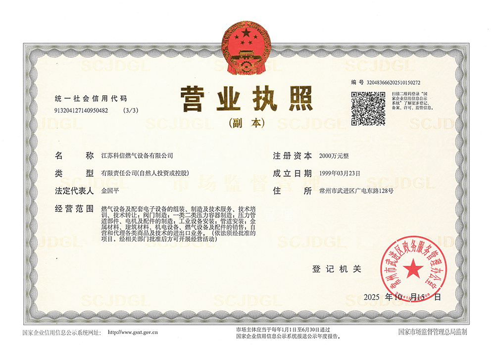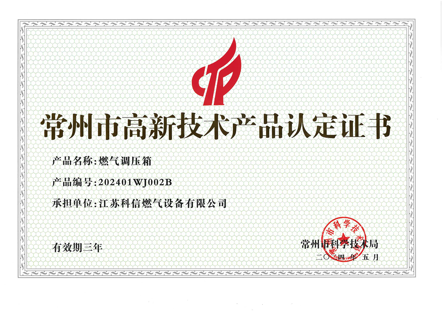 江苏科信燃气设备有限公司成立于1999年3月,建厂伊始,公司名称为“常州市科信燃气设备有限公司”,为适应公司持续发展的需求,于2014年正式更名为“江苏科信燃气设备有限公司”。自公司成立以来,科信一如既往专注于城市燃气管网的配套建设和发展提供调压设备及研究开发相关产品。